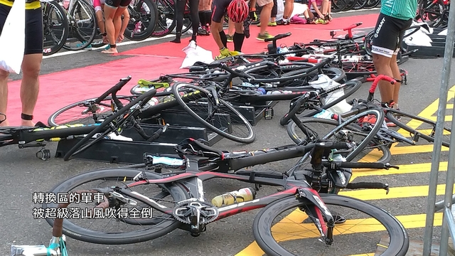 騎在路上的選手,有的被吹翻滾進田裡面,